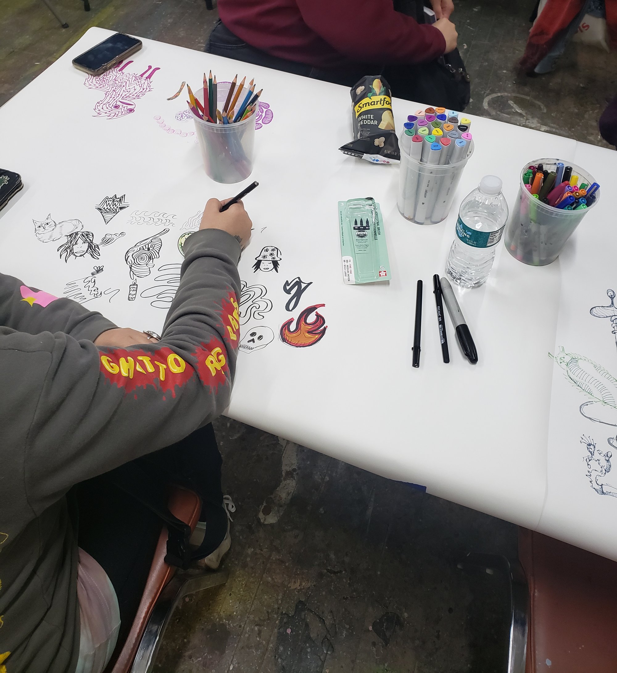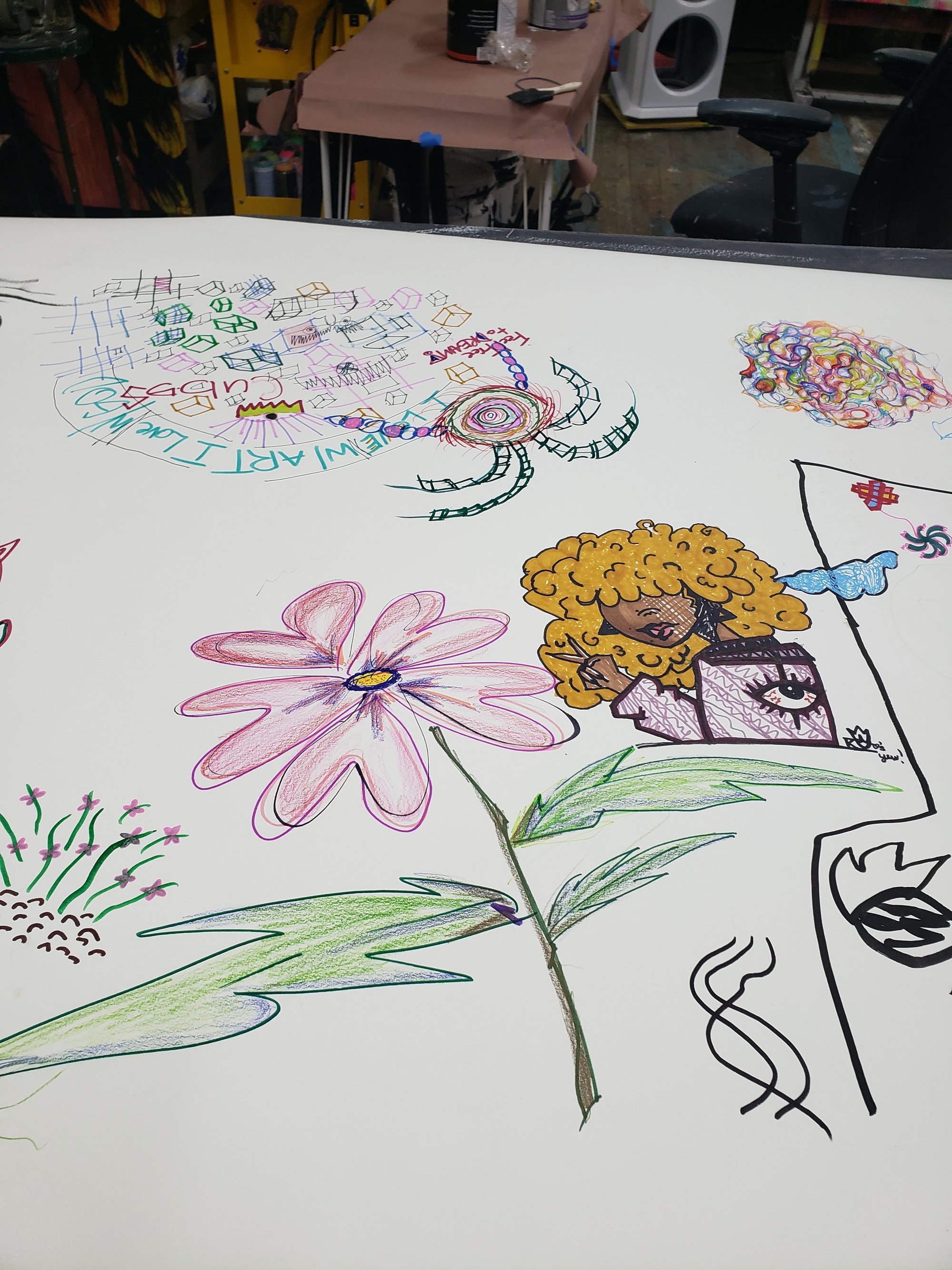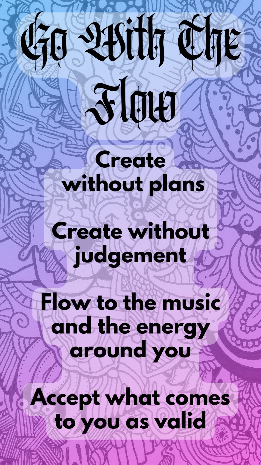 Go with the flow is a judgement free drawing meet up for artists of all levels. Giant sheets of paper and markers and pens are available for artists to stretch out, focus in, and flow onward.